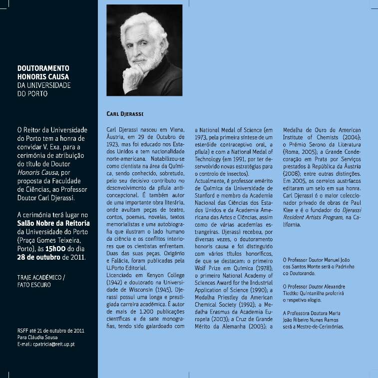 Carl Djerassi (na foto), famoso qu�mico e escritor norte-americano, assina o texto. Manuel Jo�o Monte, Professor Associado da Faculdade de Ci�ncias da U.Porto (FCUP), fez a respectiva tradu��o para portugu�s*. A companhia Seiva Trupe d�-lhe corpo. � desta combina��o que resulta "Fal�cia", t�tulo da pe�a que, no pr�ximo dia 28 de Outubro, vai ser levada � cena do Teatro do Campo Alegre.