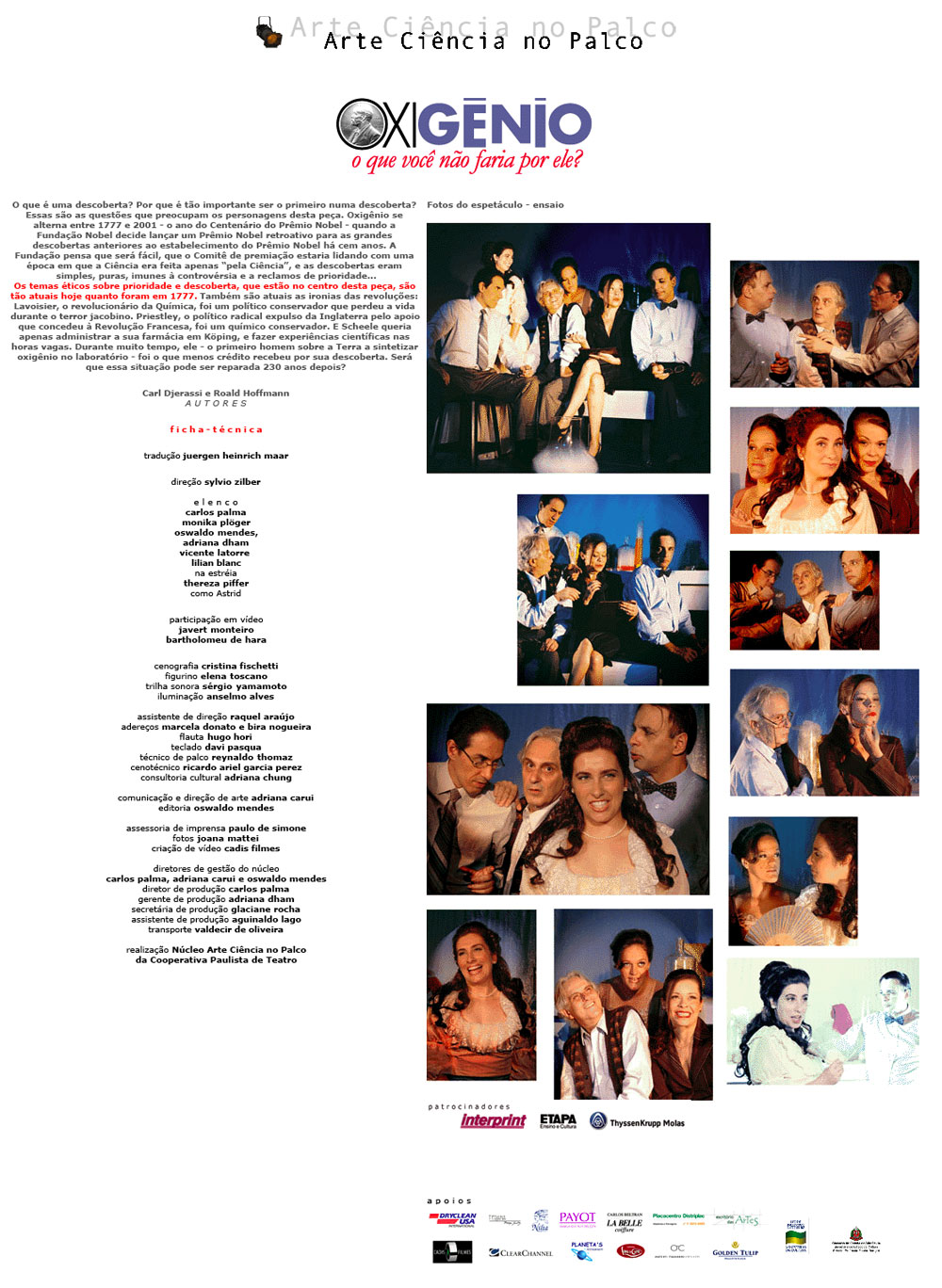 SÃO PAULO AUDITÓRIO DO ETAPA Metro Ana Rosa - Rua Vergueiro 1951 - local [TEATRO E CIÊNCIA COM CARL DJERASSI] Sexta-feira 19h30 - vagas limitadas faça sua reserva O autor vem especialmente ao Brasil para estréia de Oxigênio. Cientista austríaco, considerado o pai da pílula anticoncepcional. Fique de olho: entrevista exclusiva no Estadão, por Ubiratan Brasil. mais informações sobre o autor - em inglês ESTRÉIA DIA 8 DE ABRIL SÃO PAULO TEATRO RUTH ESCOBAR Sala Dina Sfat - Rua dos Ingleses, 209 - SP - local [OXIGÊNIO] Quinta, Sexta e Sábado 21h Domingo 19h OXIGÊNIO de Carl Djerassi e Roald Hoffmann tradução Juergen Heinrich Maar direção Sylvio Zilber com Carlos Palma, Monika Plöger, Oswaldo Mendes, Adriana Dham, Vicente Latorre, Lilian Blanc (na estréia Thereza Piffer como Astrid) Prêmio Estímulo Flávio Rangel 2006 Secretaria da Cultura do Governo do Estado de São Paulo I N G R E S S O S Quinta e sexta-feira: R$20,00 inteira, R$ 10,00 estudante e R$8,00 (grupo - mais de 30 pessoas) Sábado e domingo: R$30,00 inteira, R$15,00 estudante e R$10,00 (grupo - mais de 30 pessoas) Informações (11) 3081-8865 ou por email I N F O R M A Ç Õ E S